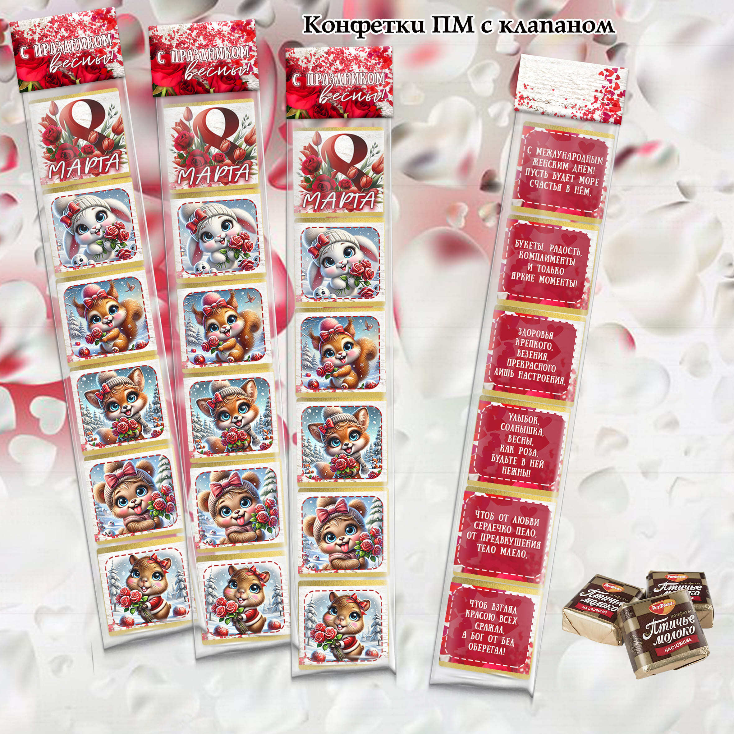 Мини-набор конфет к 8 марта – это идеальный подарок для ваших близких и родных. В каждом комплекте содержится 6 изысканных конфет, что позволяет подарить не только сладость, но и внимание. Набор включает четыре уникальных упаковки, каждая из которых наполнена мягкой текстурой и непревзойденным вкусом птичьего молока.