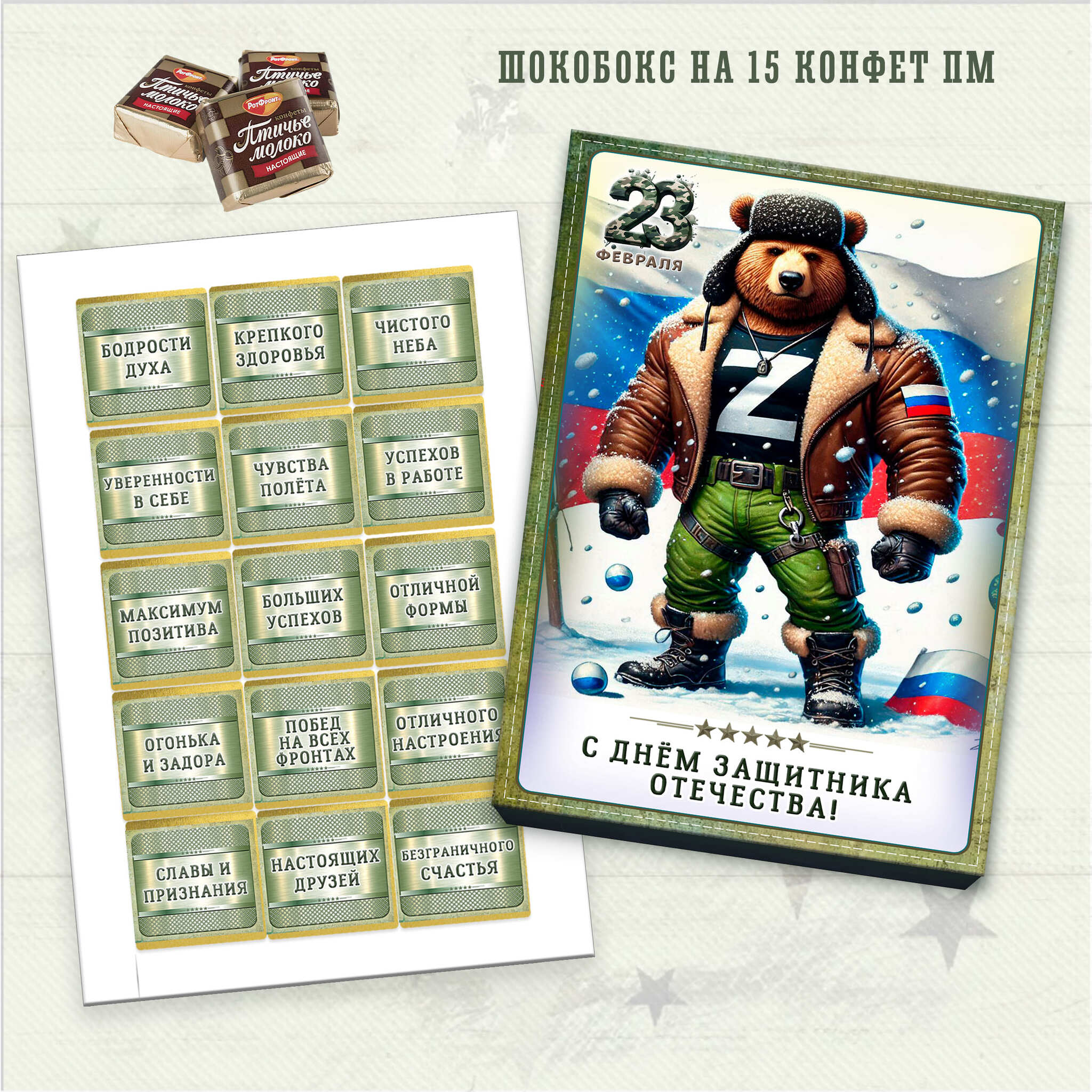 Конфеты в наборе включают в себя популярное птичье молоко, обладающее нежной текстурой и насыщенным вкусом. Упаковка приковывает взгляд благодаря яркому и тематическому дизайну, который прекрасно передает дух праздника. Такой сладкий сюрприз не только порадует, но и станет символом уважения и любви к защитникам Отечества.