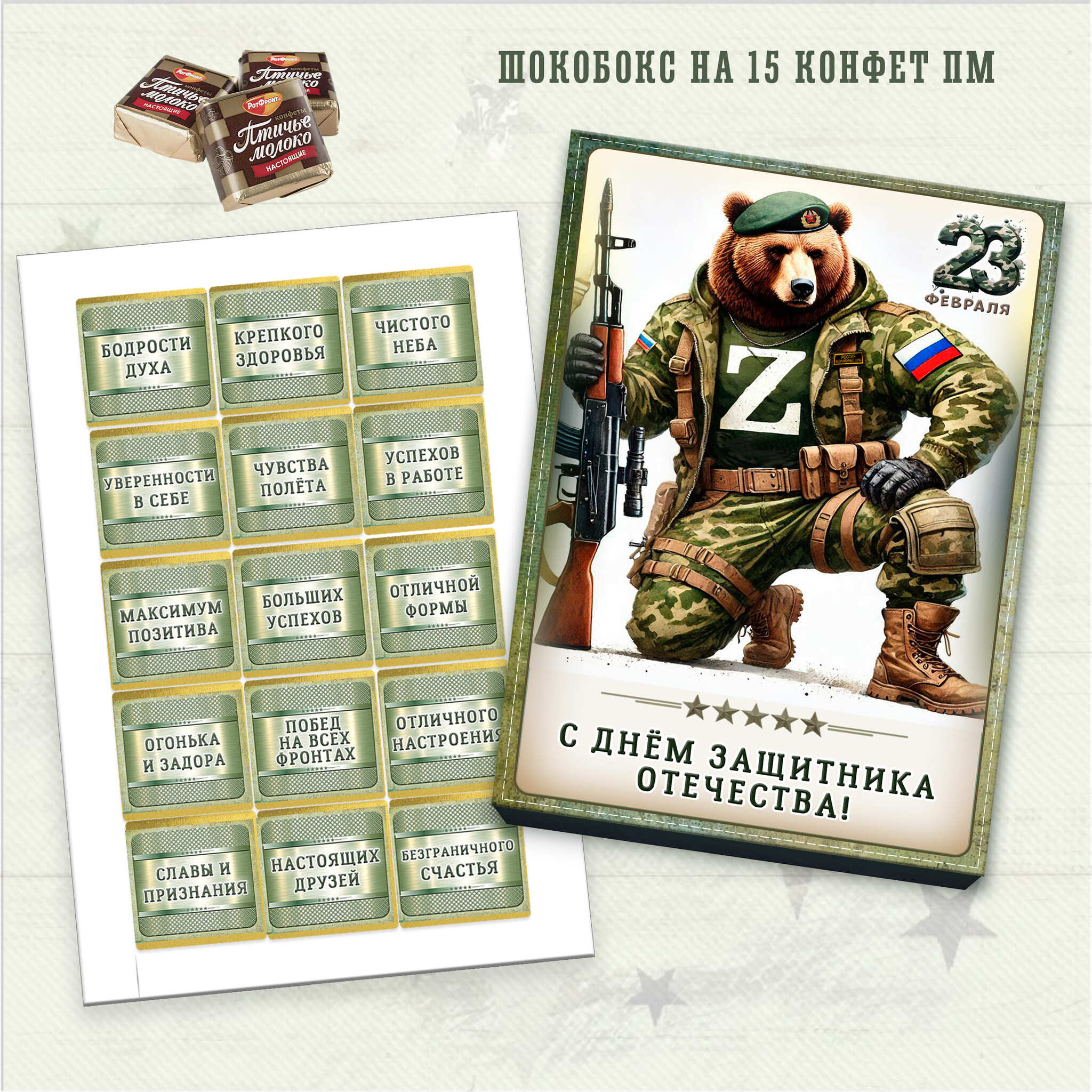 Конфеты в наборе включают в себя популярное птичье молоко, обладающее нежной текстурой и насыщенным вкусом. Упаковка приковывает взгляд благодаря яркому и тематическому дизайну, который прекрасно передает дух праздника. Такой сладкий сюрприз не только порадует, но и станет символом уважения и любви к защитникам Отечества.