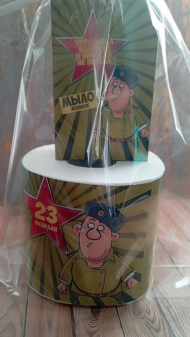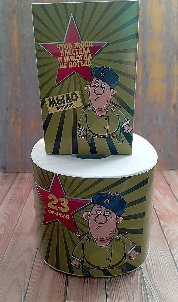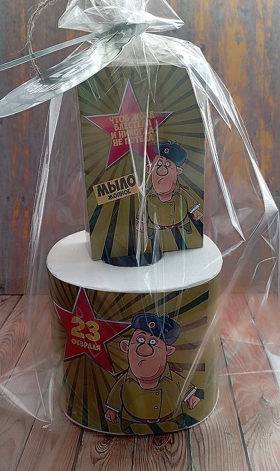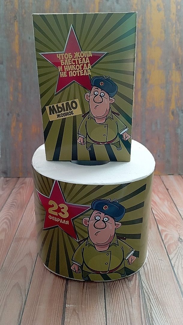В состав набора входит туалетная бумага, которая выделена особой оригинальной упаковкой с праздничным дизайном. Это отличный способ подчеркнуть веселый и шутливый характер подарка. Кроме того, в наборе есть мыло с приятным мужским ароматом, которое создаст атмосферу комфорта и свежести в ванной комнате.