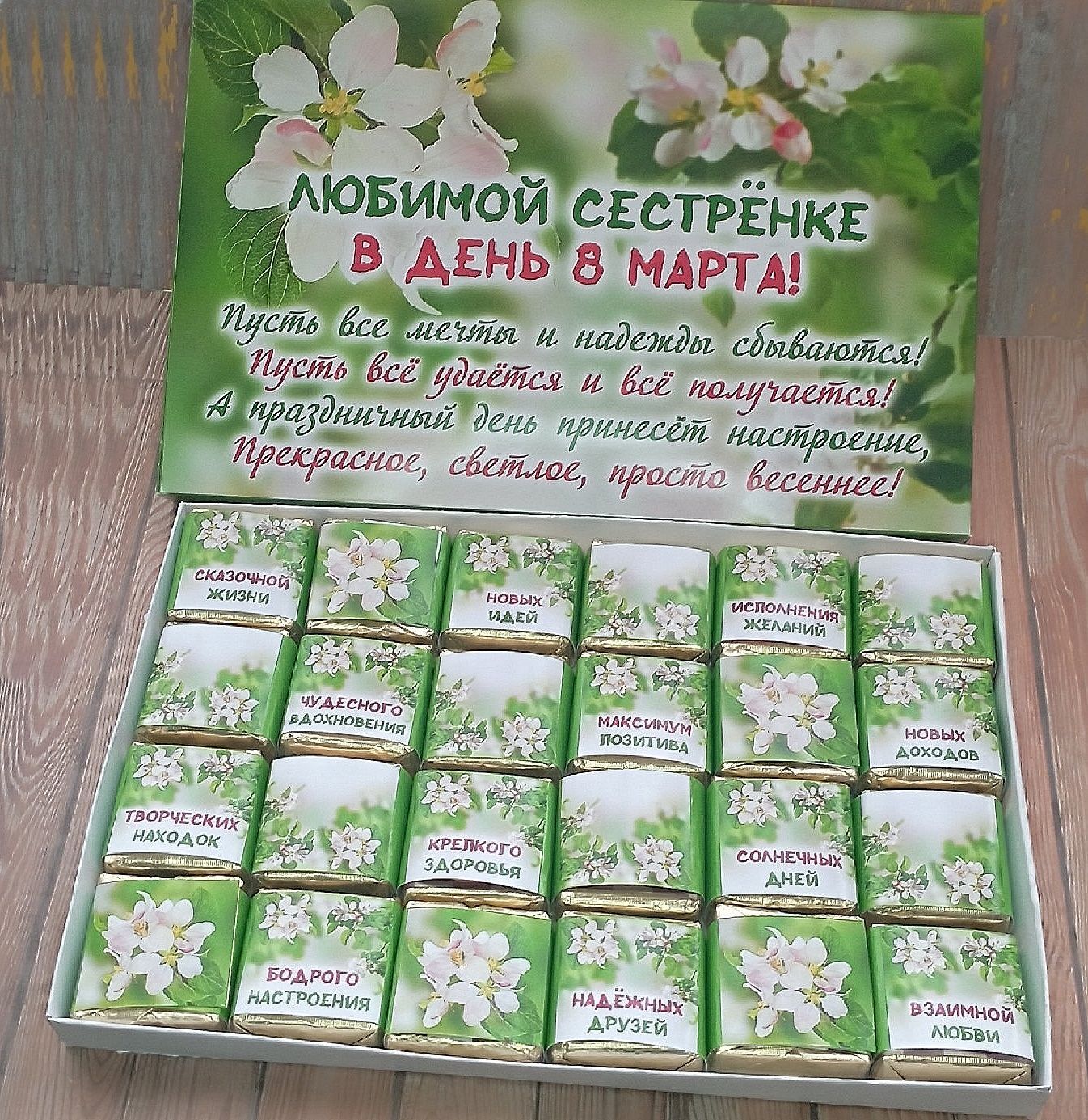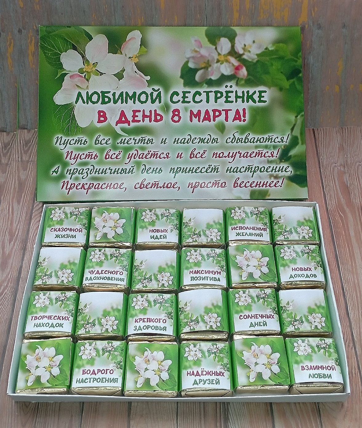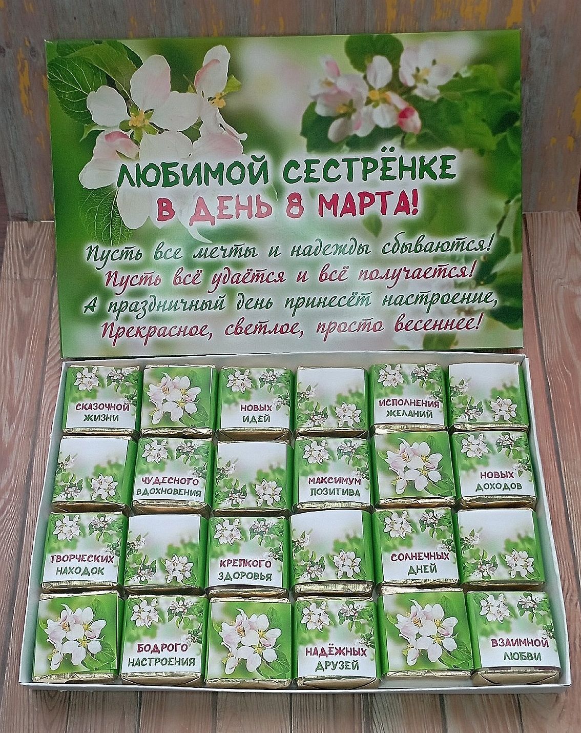 Не упустите возможность порадовать свою любимую крестную в этот особенный день. Закажите подарочный набор конфет "Любимой сестренке с 8 марта" прямо сейчас и сделайте ее праздник незабываемым!