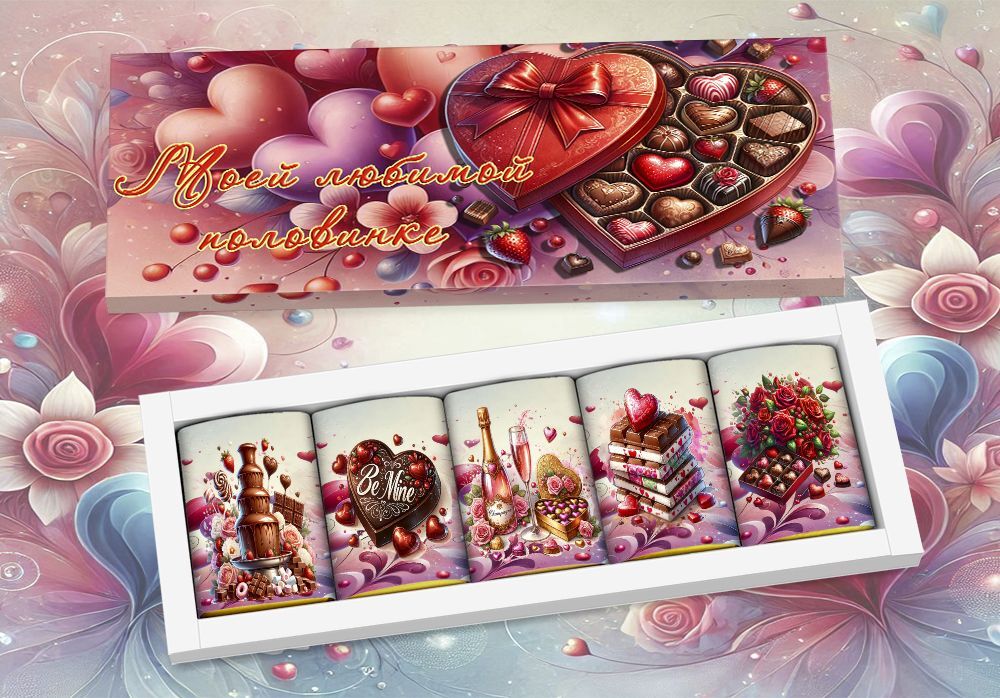 Подарочный набор "Моей половинке" состоит из пяти шоколадок. Этот набор станет идеальным подарком для вашей любимой, особенно в важный день, такой как 14 февраля или 8 марта или день рождения. Каждая шоколадка обладает уникальным оформлением, что делает их поистине неповторимыми.