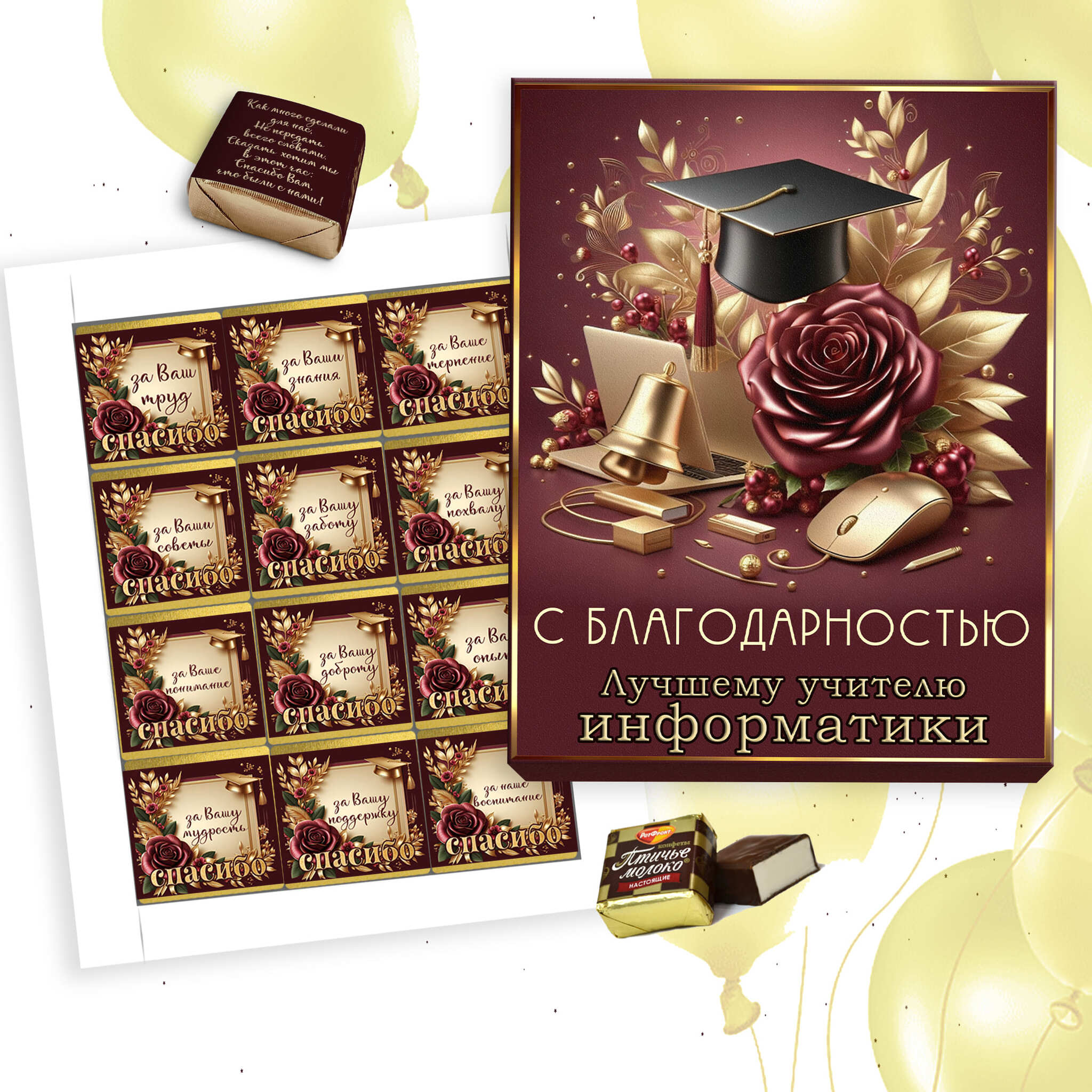 Шокобокс "С благодарностью учителю информатики" - это идеальный способ выразить свою признательность и уважение к любимому педагогу. Этот оригинальный подарок на выпускной включает в себя набор из 12 конфет, которые порадуют любого сладкоежку. В шокобоксе вы найдете изысканные конфеты, нежное "птичье молоко", которое подарит уникальное вкусовое наслаждение.