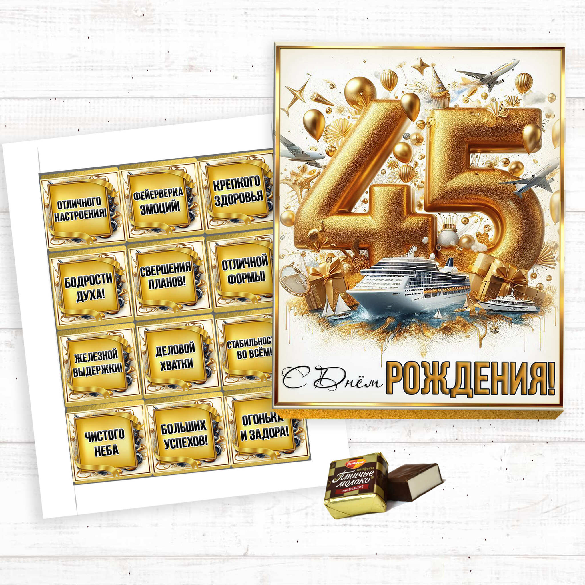 Шокобокс «С днем рождения, 45 лет» — это идеальный выбор для поздравления и подарка на день рождения. Набор включает 12 уникальных конфет, которые порадуют и удивят именинника. Эта сладкая композиция сочетает в себе разнообразные вкусы и текстуры, включая популярные конфеты с птичьим молоком. Каждый элемент установлен в красивую упаковку, усиливающую впечатление от подарка.