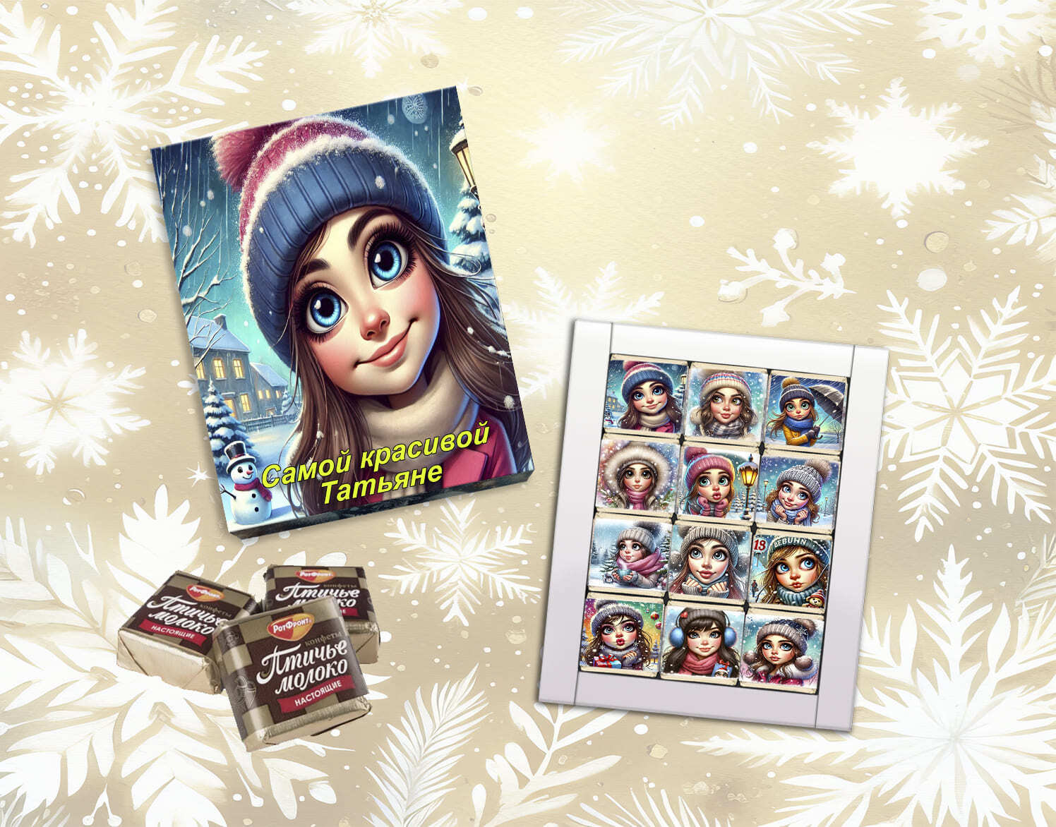 Шокобокс Самой красивой Татьяне - это отличный способ порадовать ваших близких в День Татьяны. Набор включает 12 изысканных конфет, среди которых вы найдете любимые сладости, такие как птичье молоко.