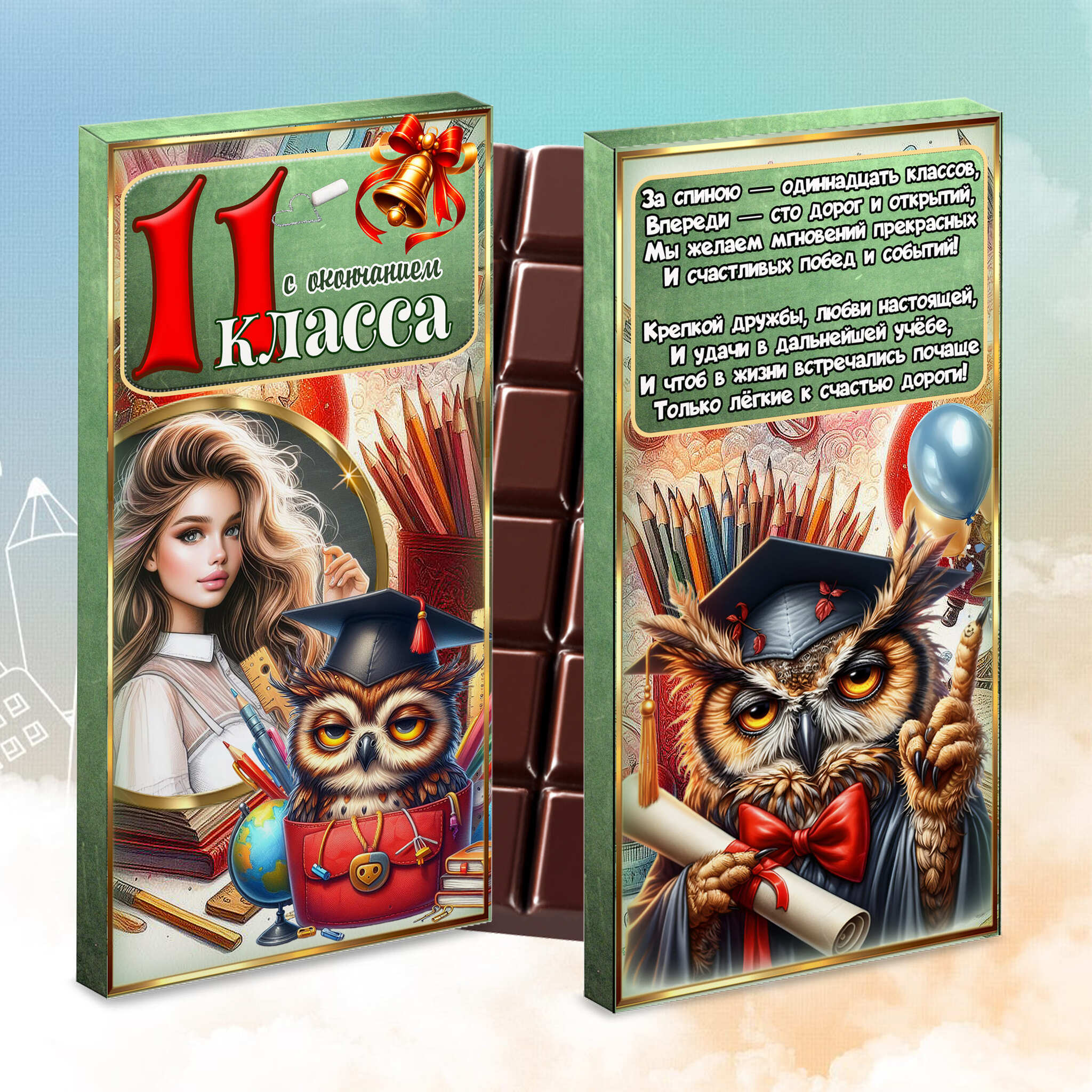 Эта подарочная упаковка создана с заботой, подчеркивая значимость момента. Шоколад в ней упакован с большим вкусом и эстетичностью, что делает его не только сладким угощением, но и прекрасным элементом праздничной атмосферы. Идеальный выбор для того, чтобы выразить свои чувства и поздравить с успешным завершением школьного пути.
